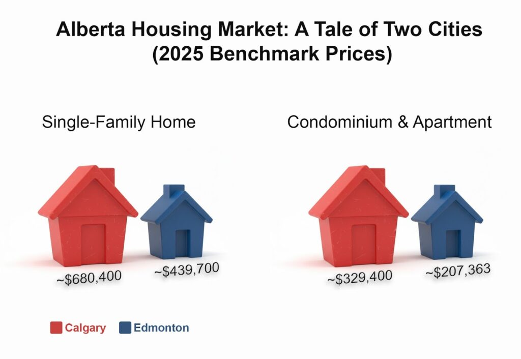 A: As of 2025, a benchmark single-family home in Edmonton is approximately $150,000 to $200,000 cheaper than in Calgary. A one-bedroom apartment is $250 to $400 cheaper per month.