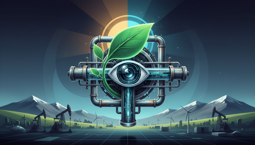 A robotic eye intertwined with a glowing green leaf and a steel pipeline, symbolizing the fusion of artificial intelligence, environmental monitoring, and industrial infrastructure.