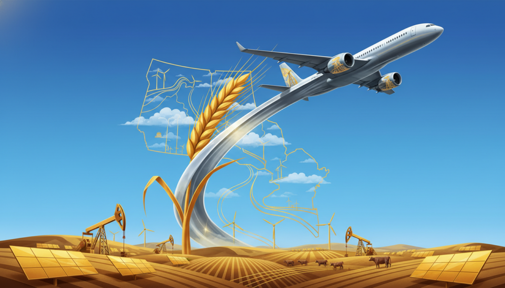 A vibrant, golden stalk of wheat morphing seamlessly into the sleek, silver contrail of a jet engine, set against a bright, cloudless blue sky.